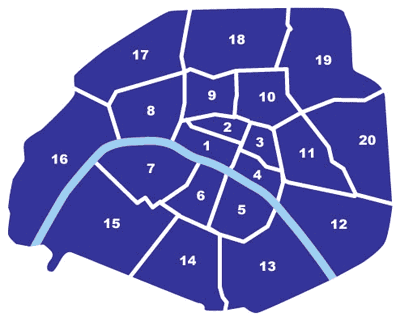 R: O mapa da cidade de Paris é bem redondinho, e a numeração dos arrondissements começa bem no centro da cidade, e vai crescendo ao redor do centro como se fosse um caracol, até o 20°. Dessa forma, os arrondissements de numeração mais alta estão mais afastados do centro, como você pode observar no mapa abaixo: